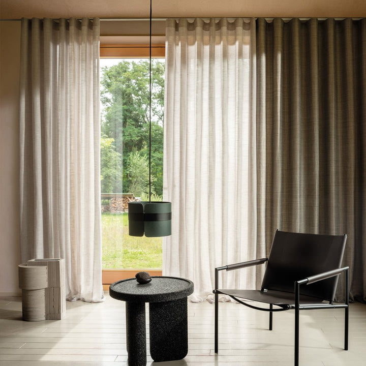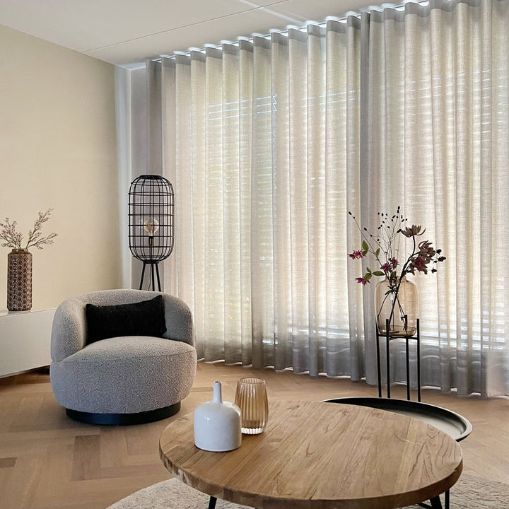 Alle gordijnen worden standaard afgewerkt met een geïntegreerd loodkoord aan de onderzijde en kunnen in 1 of in 2 delen worden opgehangen. Je kunt de gordijnen bestellen met een enkele plooi, dubbele plooi of wave-plooi.